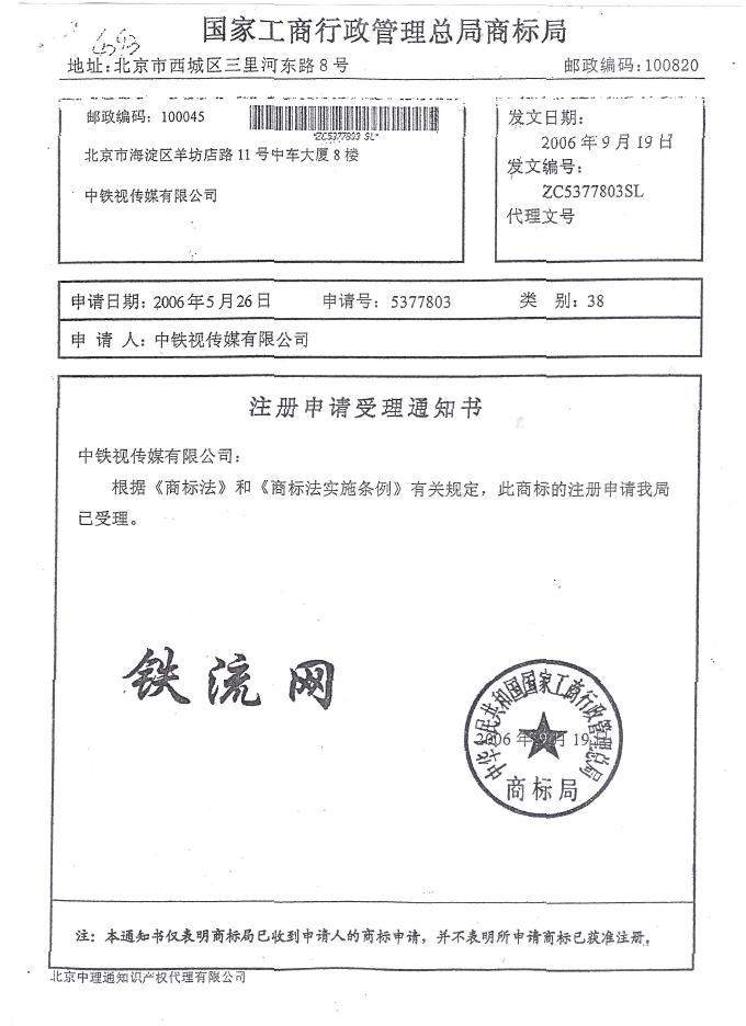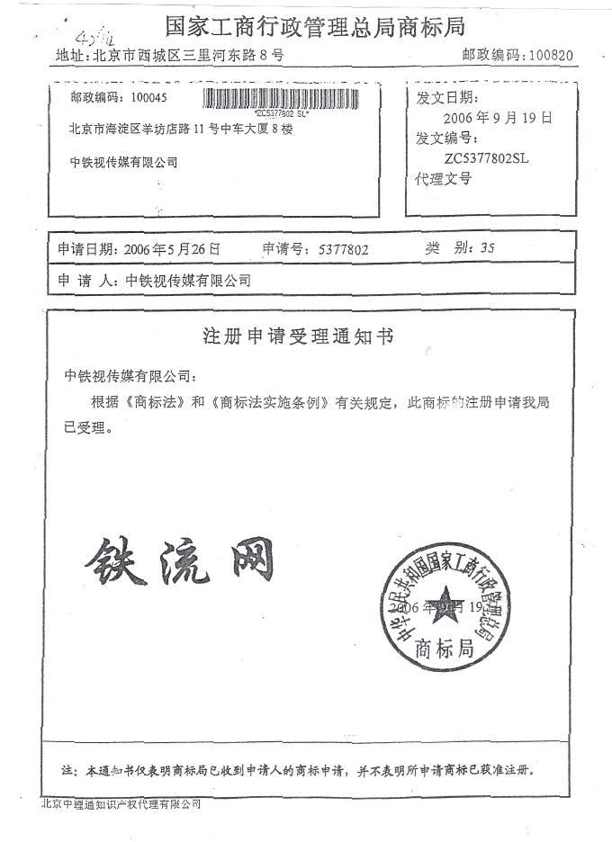 (19)“铁流网”国家工商行政管理总局商标局《注册申请受理通